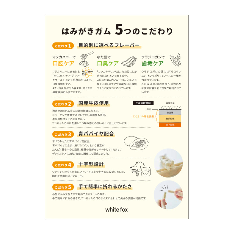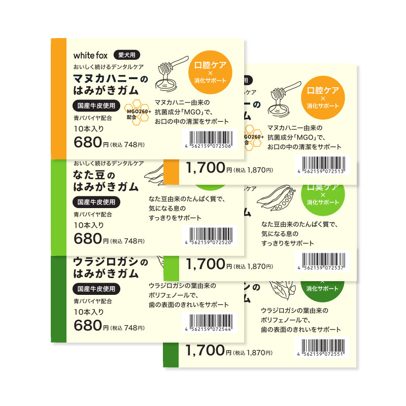| 素材 | ■マヌカハニーのはみがきガム 【原材料】 牛皮、米粉、マヌカハニー、青パパイヤ 【栄養成分<1本(標準5.3g)あたり>】 粗たんぱく質:28.0%以上、粗脂肪:4.6%以上、粗繊維: 0.1%以下、粗灰分:1.9%以下、水分:8.8%以下 【エネルギー】 18kcal/1本あたり ■なた豆のはみがきガム 【原材料】 牛皮、米粉、なた豆、青パパイヤ 【栄養成分<1本(標準5.3g)あたり>】 粗たんぱく質:28.0%以上、粗脂肪:4.6%以上、粗繊維: 0.1%以下、粗灰分:1.9%以下、水分:8.8%以下 【エネルギー】 19kcal/1本あたり ■ウラジロガシのはみがきガム 【原材料】 牛皮、米粉、ウラジロガシ、青パパイヤ 【栄養成分<1本(標準5.3g)あたり>】 粗たんぱく質:29.2%以上、粗脂肪:4.8%以上、粗繊維:0.3%以下、粗灰分:2.0%以下、水分:8.1%以下 【エネルギー】 18kcal/1本あたり |