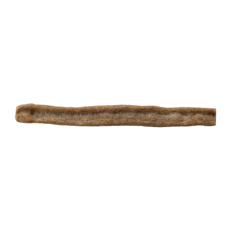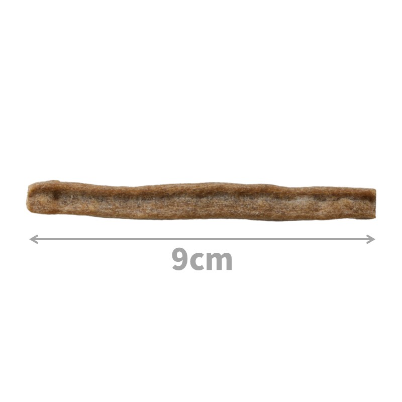 サイズ 【原材料】 牛皮、米粉、ウラジロガシ、青パパイヤ 【栄養成分<1本(標準5.3g)あたり>】 粗たんぱく質:29.2%以上、粗脂肪:4.8%以上、粗繊維:0.3%以下、粗灰分:2.0%以下、水分:8.1%以下 【エネルギー】 18kcal/1本あたり